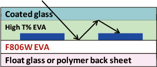 F?RST? F806W EVA is characterized as highly reflective. Its unique optical property can increase the effective utilization of light ultimately enhancing the power output of PV modules.  F806W EVA also provides a solution for white overflow appearance issues in processing of modules.
