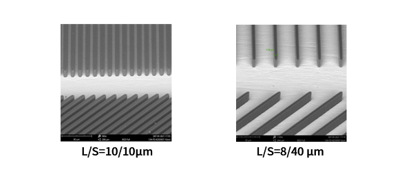 FD-800系列是為BGA、CSP等半導體封裝基板開發的LDI干膜,具有高感度、高解析、底部殘足小、電鍍污染性好、干膜側壁形狀良好等各種特點,適用于微細線路蝕刻和半加成法(mSAP)工藝。